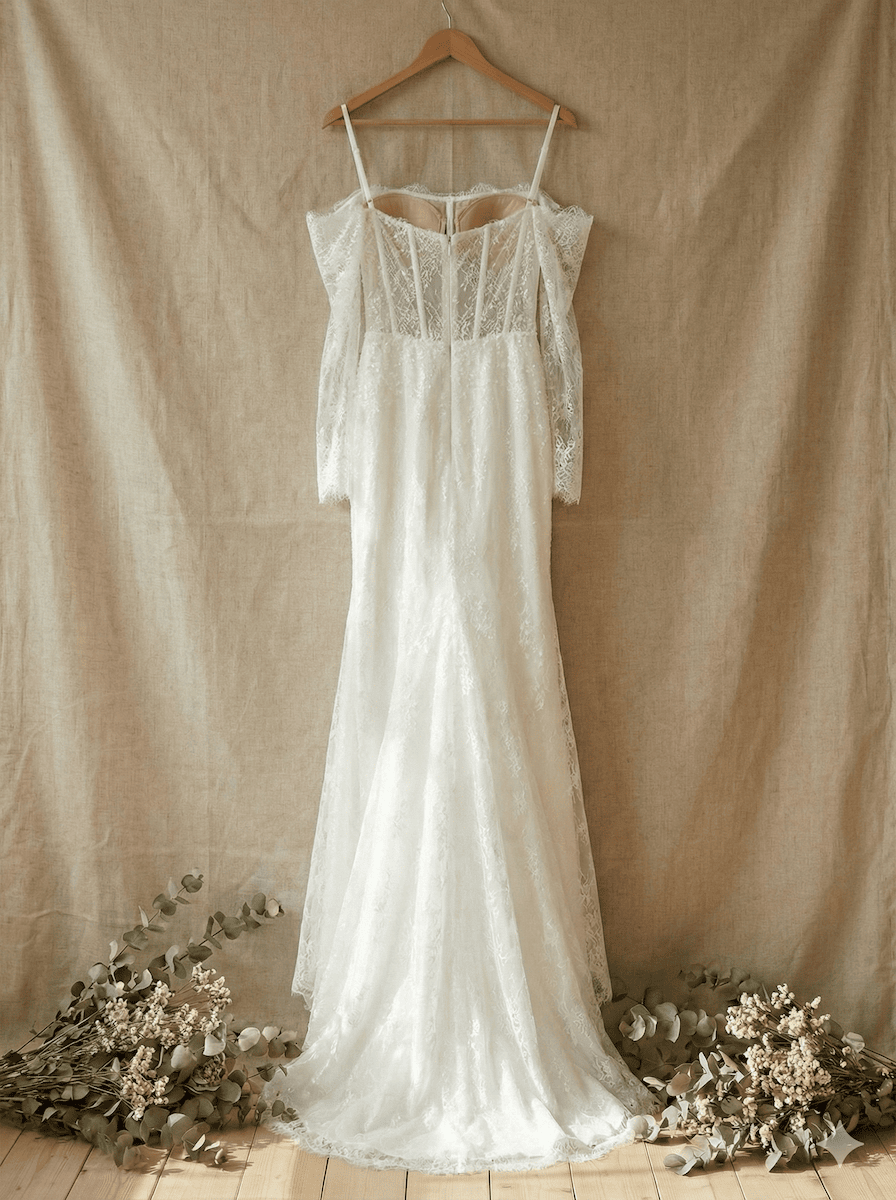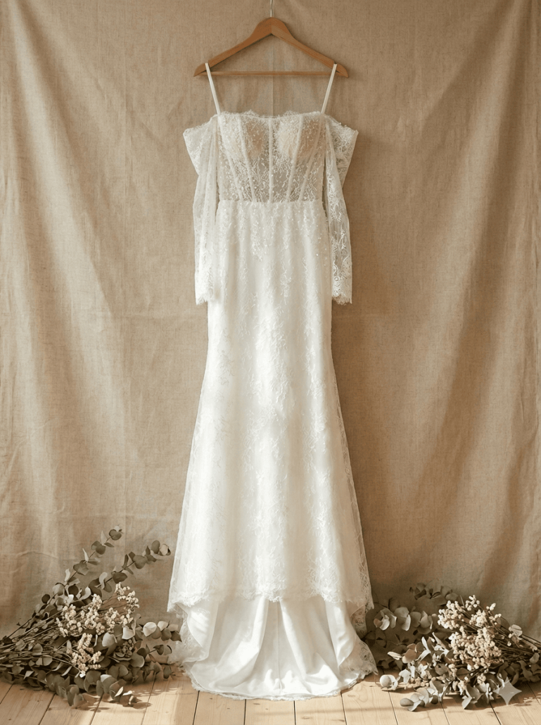 一字領結合細緻蕾絲面料,展現典雅浪漫氣息。魚尾裙擺修飾身形比例,勾勒柔和曲線,適合宴會、約會或需要精緻造型的場合。