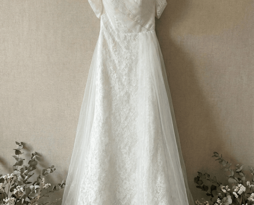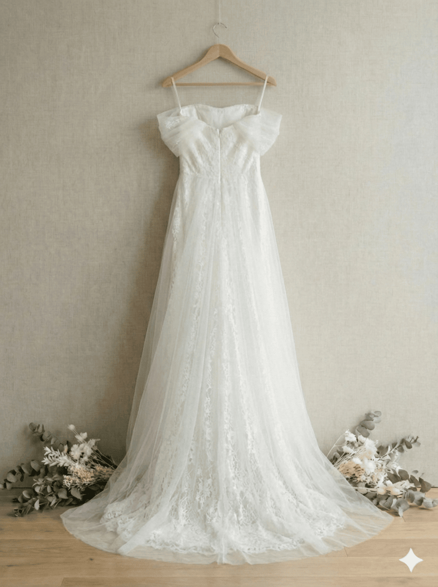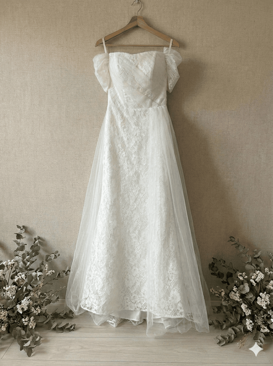 落肩設計展現柔和肩線,蕾絲紗材質輕盈細膩。魚尾裙型拉長腿部比例,整體風格優雅中帶有浪漫氛圍。
