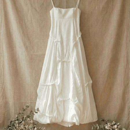 細肩帶抓褶造型緞面長裙